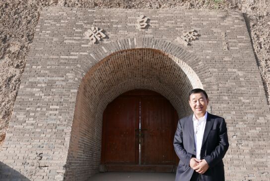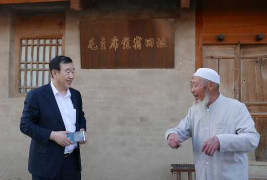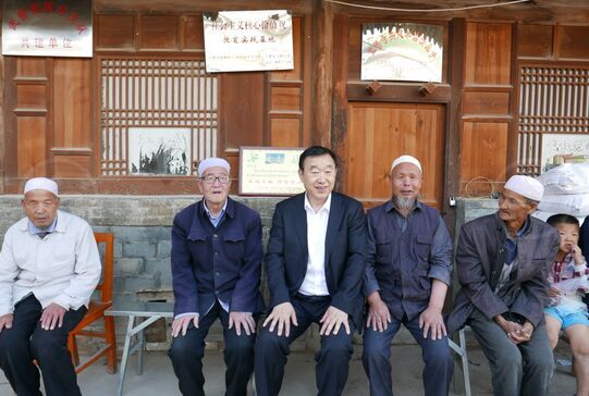 2016年6月12日,张保和在宁夏西吉县采风期间在单家集毛主席住居旧址与回族老大爷交流