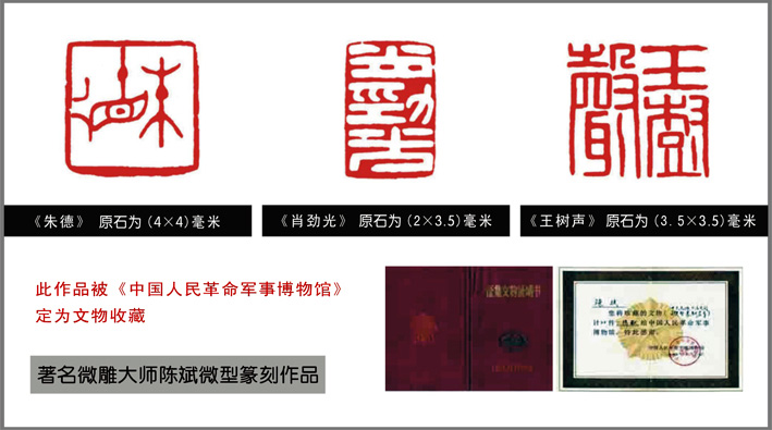 作品描述: 著名微雕大师陈斌《20枚将帅名录选刻》微型篆刻作品被《中国人民革命军事博物馆》定为文物收藏