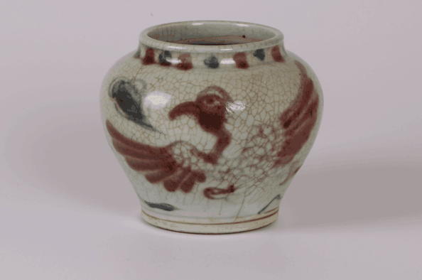 此罐唇口,短颈,溜肩,鼓腹下收,圈足。以青花绘绘祥云,侧面及背面的景象,以釉里红饰凤鸟图案,青花色彩浓艳,釉里红略暗,纹饰丰富,层次清晰,主题突出,器型周正,釉面莹润,底足露胎。具有极高的收藏研究价值。