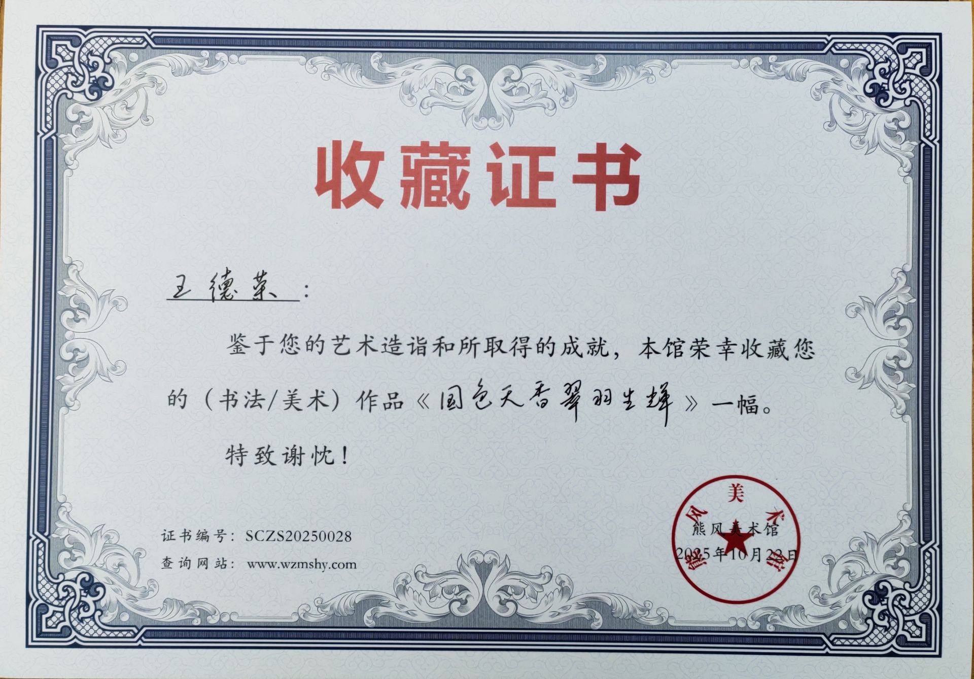 10月22日,第九届艺术家发展论坛名家作品展在湖南张家界熊风美术馆隆重开幕。著名画家王德荣创作的小写意绘画作品《国色天香翠羽生辉》以其精湛的技艺和独特的艺术表现力获得广泛赞誉,并被熊风美术馆正式收藏。