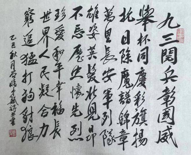 参展是他检验自我、拓展视野的重要途径。自退休以来,他累计参加全省、全国及国际书法交流展128场次,三次进京参展便是其中的亮眼注脚。他始终认为,书法作品不应是孤芳自赏的案头清供,而需在公众的审视与同行的切磋中彰显价值。每一次参展,他都以谦逊之心倾听同行见解、吸纳建议,将交流中的思想碰撞转化为创作的灵感源泉,保持着对艺术追求的昂扬心态。在12月29日自作诗《荣宝斋里见荣光》中,他写道:“群英聚首大风扬,荣宝斋中墨韵香。人寿年丰银发亮,幕开盛世掌声长。神奇白石多灵性,永玉虾图夺目光。吾入华堂心有愧,唯余斗志更高昂。”(注:2025年12月29日,作者赴北京参加“月圆人寿——2025年荣宝斋全国银龄书画展”。其作品“九三阅兵彰国威”自赋诗入选。)