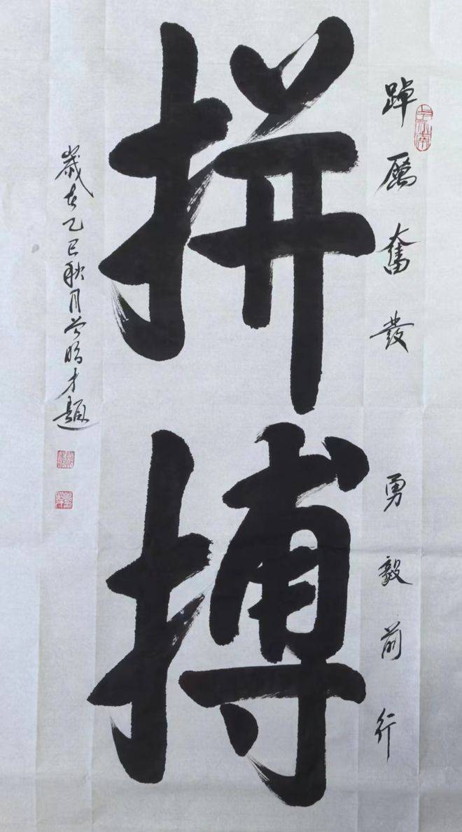 他为基层文化广场、图书馆、农家书屋创作并赠送大量书法作品,将对党的热爱、对人民的深情、对祖国的赞颂融入笔墨之中。从历史古迹的文化熏陶到田间地头的生活感悟,这些丰富的实践经历为他的创作注入了源源不断的活力,使他的作品既有文化厚度,又有生活温度,能够引发观者的强烈共鸣。正如他所说,书法艺术不仅是修身养性之具,更要成为连接群众、传递美好的桥梁。