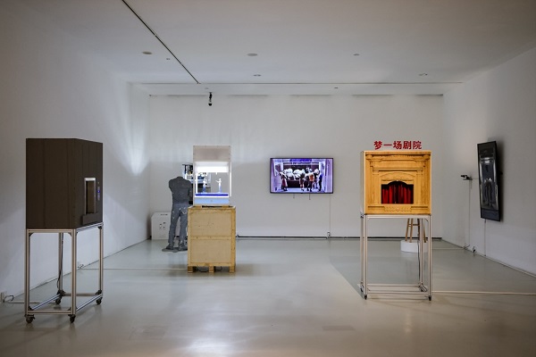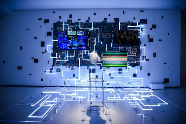 蒋晶、黄晓红《将来临界态》 亚克力、电路板、LED灯带、电视、木板 300cmx480cmx480cm 2025年