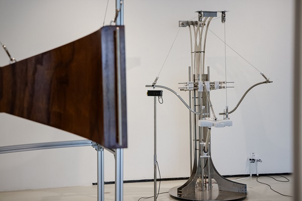 李世捷《叩问》装置、新西兰松、老鼠胶、电机 200cmx90cmx40cm 2025年 是否可以反复叩问自己与他人