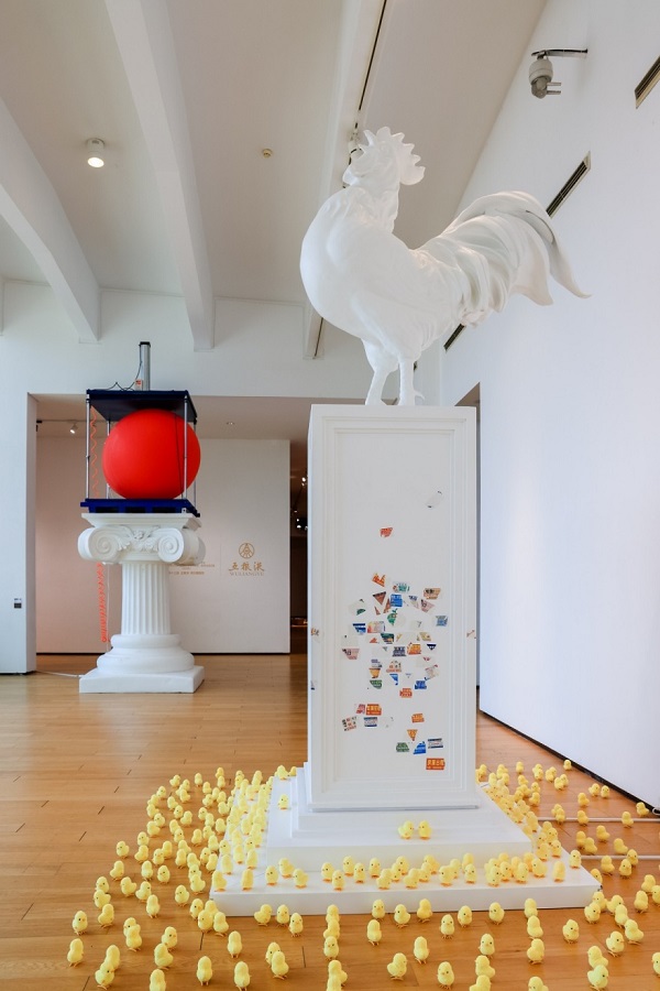 马东利《天下白1》 玻璃钢雕塑、电动改装小黄鸡、发条小黄鸡 400cm×180cm×180cm 2024年